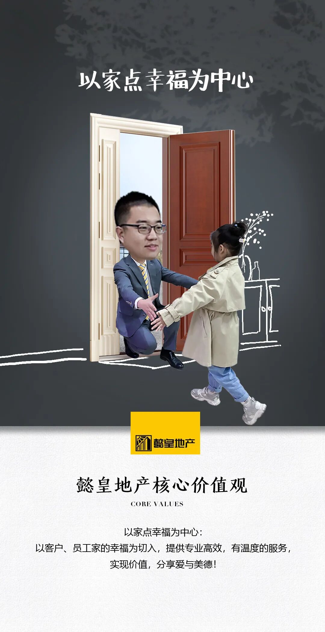 轉眼間15年的歲月悄然流逝,白松朝先生的容顏成熟了幾分,顯得格外沉穩且有魅力!而他創(chuàng )辦的洛陽(yáng)懿皇房產(chǎn)經(jīng)紀有限公司,在時(shí)間的加持下,愈發(fā)具有規模與活力。做有大愛(ài)、受尊重、有價(jià)值、有品質(zhì)的百年企業(yè),是懿皇地產(chǎn)的愿景與藍圖,愛(ài)與尊重、價(jià)值與品質(zhì),白總希望每一個(gè)從業(yè)者都能得到尊重,能夠為社會(huì )發(fā)揮最大價(jià)值,支撐著(zhù)宏大的愿景得以實(shí)現的是懿皇系統以及深厚的組織文化。以家為種子,孝親父母為根基、師徒帶教傳承、價(jià)值觀(guān)綻放、幸福果實(shí)摘取,懿皇的企業(yè)文化樹(shù)扎根深土,枝繁葉茂。