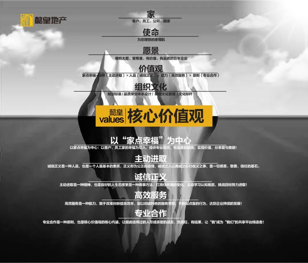 2020年8月開(kāi)始,懿皇地產(chǎn)組織公司全員進(jìn)行新的核心價(jià)值觀(guān)研討。內在力量的提升,是企業(yè)發(fā)展的不竭動(dòng)力。數十場(chǎng)價(jià)值觀(guān)研討會(huì ),每場(chǎng)歷時(shí)五六個(gè)小時(shí),每個(gè)人都在表達、探討、爭論,尋找最核心的方向,如果你也在現場(chǎng),你也會(huì )感受到那份熱切與投入。最終,在全員月度大會(huì )時(shí),經(jīng)過(guò)千余人的投票,懿皇地產(chǎn)新的核心價(jià)值觀(guān)顯露出來(lái):投票“專(zhuān)業(yè)”的占比60.17%,投票“合作”的占比50.68%,投票“服務(wù)”的占比47.8%……價(jià)值觀(guān)的研討,是一次不同思想的碰撞,更是一次統一思想的凝聚與升華。也許有人會(huì )疑問(wèn),作為營(yíng)銷(xiāo)型公司,業(yè)績(jì)和文化孰輕孰重,是否值得投入這么大的精力與時(shí)間去組織文化建設,我們的回答是,值得!冰山的巍峨壯觀(guān)是因為有看不見(jiàn)的80%的力量支撐,業(yè)績(jì)是露出水面的部分,而文化與價(jià)值觀(guān)是隱藏的不可或缺的力量,支撐著(zhù)冰山的穩定與軌跡。